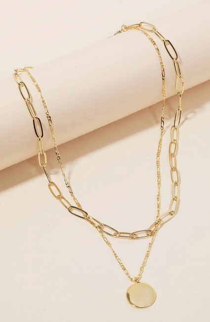 Timeless and refined, this layered necklace pairs delicate gold chains with subtle disc accents for a touch of understated elegance. Perfect for layering or wearing alone to elevate any look.