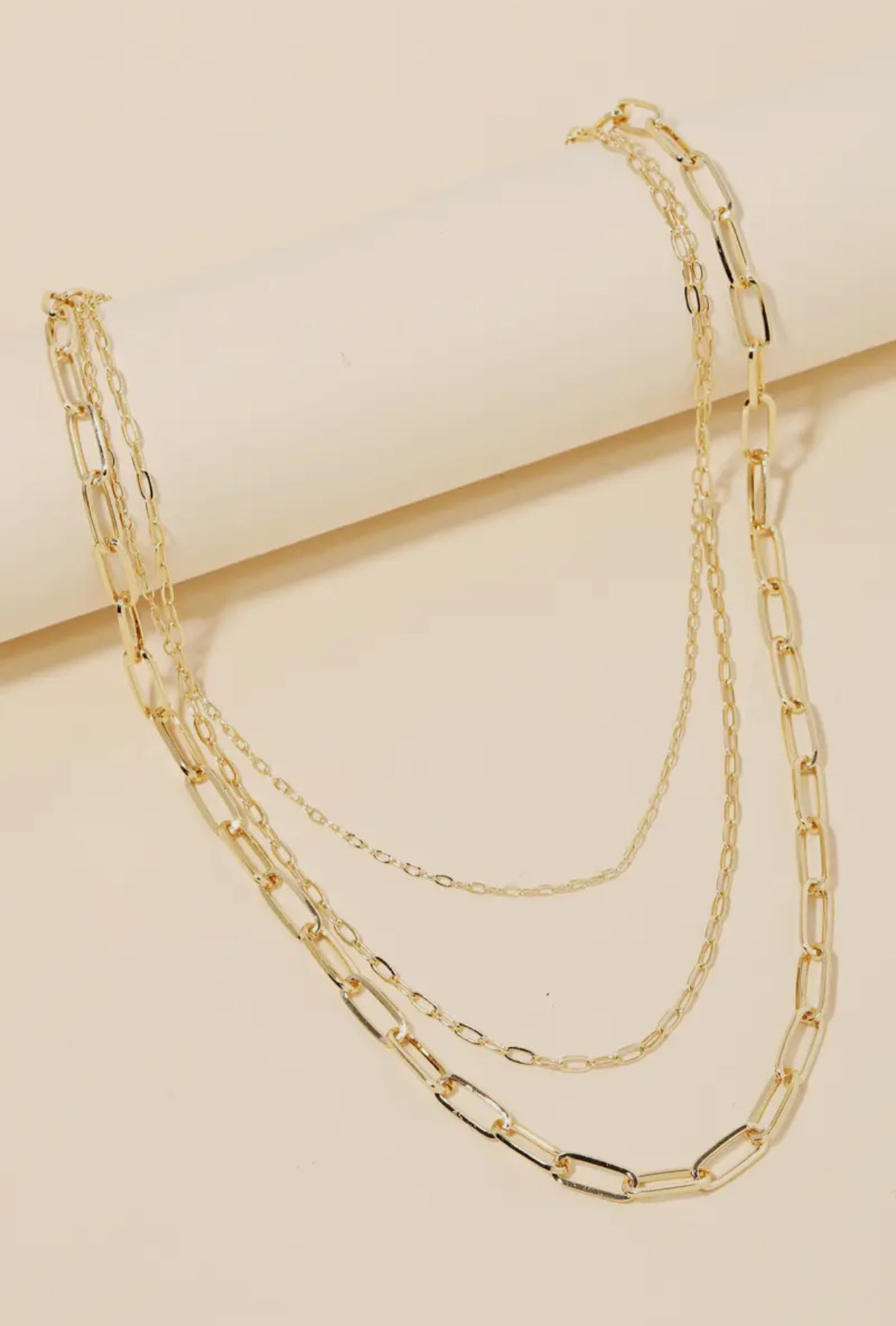 Modern and refined, this necklace features three beautifully layered paperclip chains for a clean, sophisticated look. Perfect for adding a subtle touch of shine to any outfit.