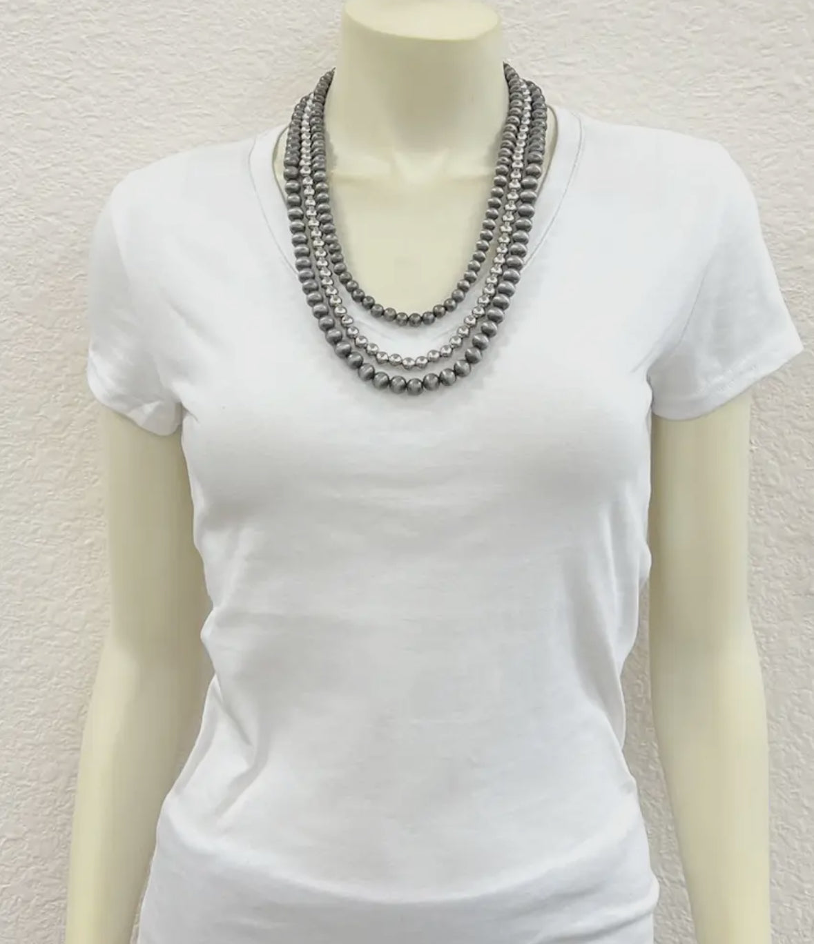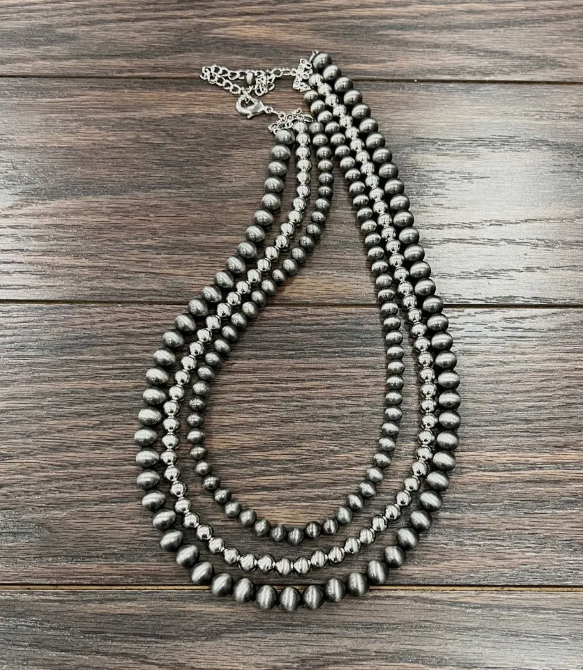 Bold, handcrafted, and effortlessly chic, this three-strand silver and Navajo bead necklace blends texture and dimension in a striking layered design.