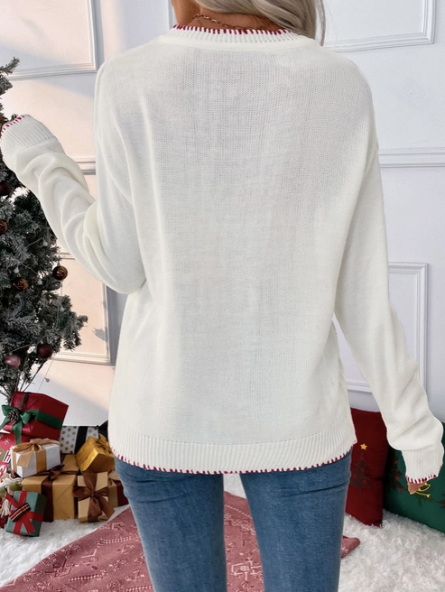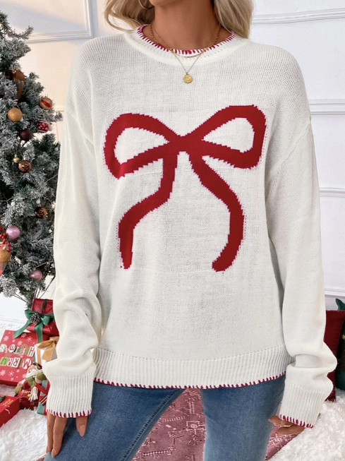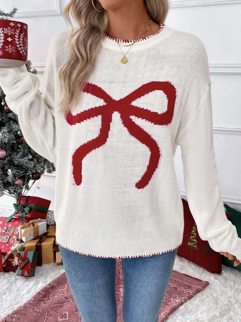 Sweet and festive, this cozy knit features a bold red bow front and charming red stitch details along the crew neckline and hems. Dropped shoulders and contrast ribbing add an easy, relaxed feel—perfect for pairing with denim for a playful holiday look.