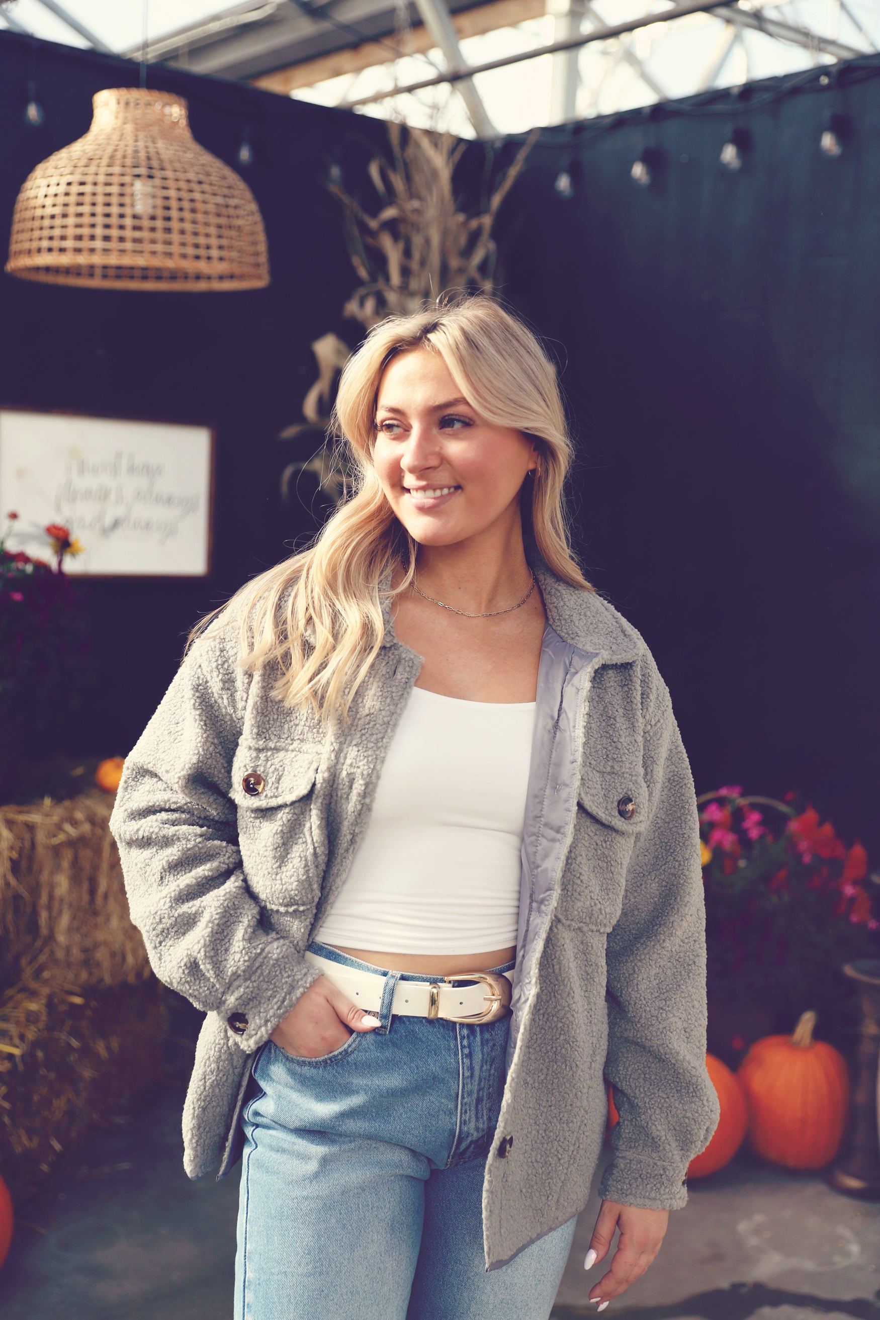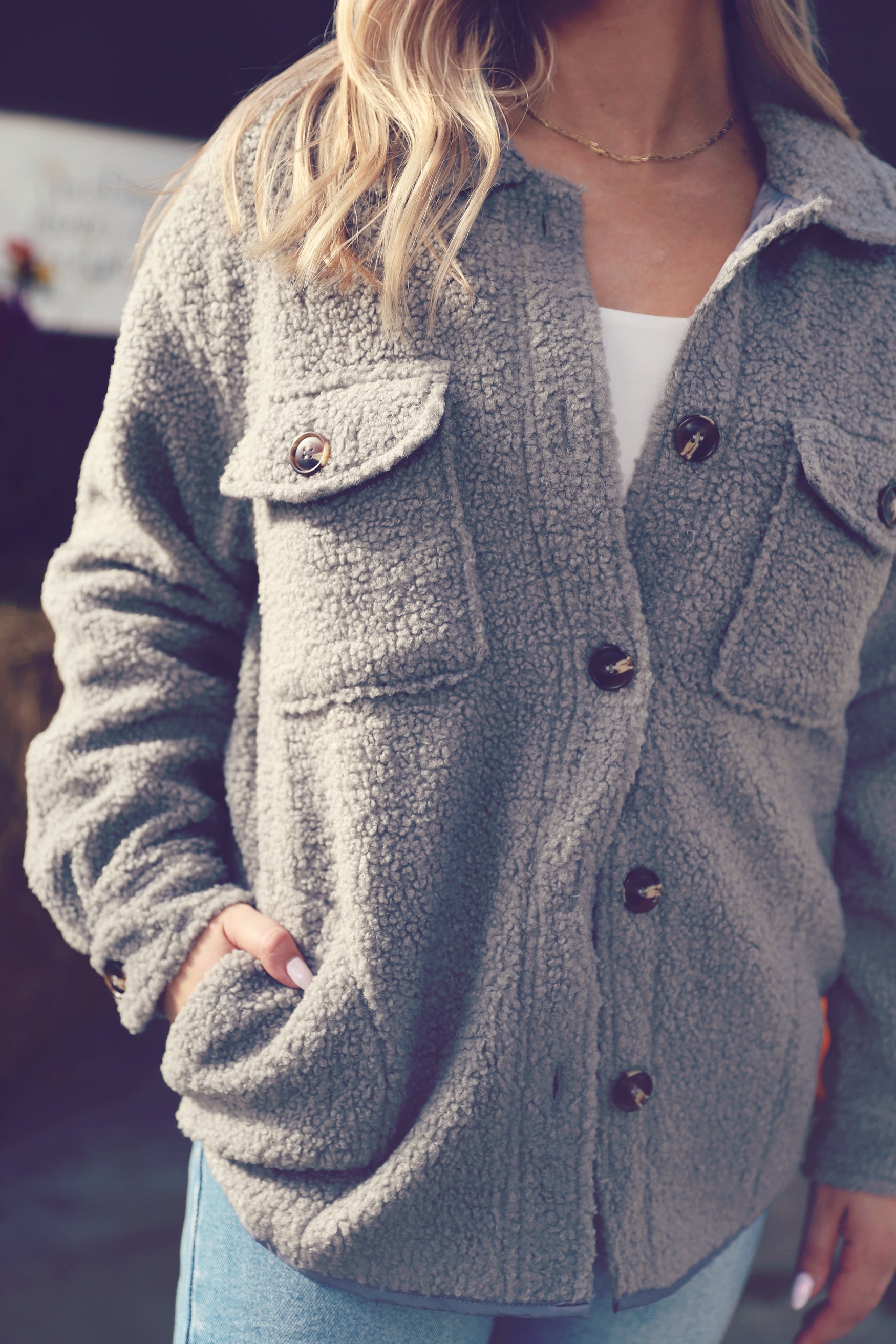 The ultimate layer for crisp mornings and cool nights, this soft grey shacket is what cozy dreams are made of. With its plush, fuzzy texture and easy button-down front, it’s perfect for throwing on over tees, thermals, or even lightweight sweaters. The relaxed fit keeps things comfy without feeling bulky, and the neutral grey goes with just about everything in your fall rotation. Pair it with leggings and boots for a morning coffee run, or style it with jeans and a graphic tee for a casual day out. Cozy, practical, and cute—just how we like it.