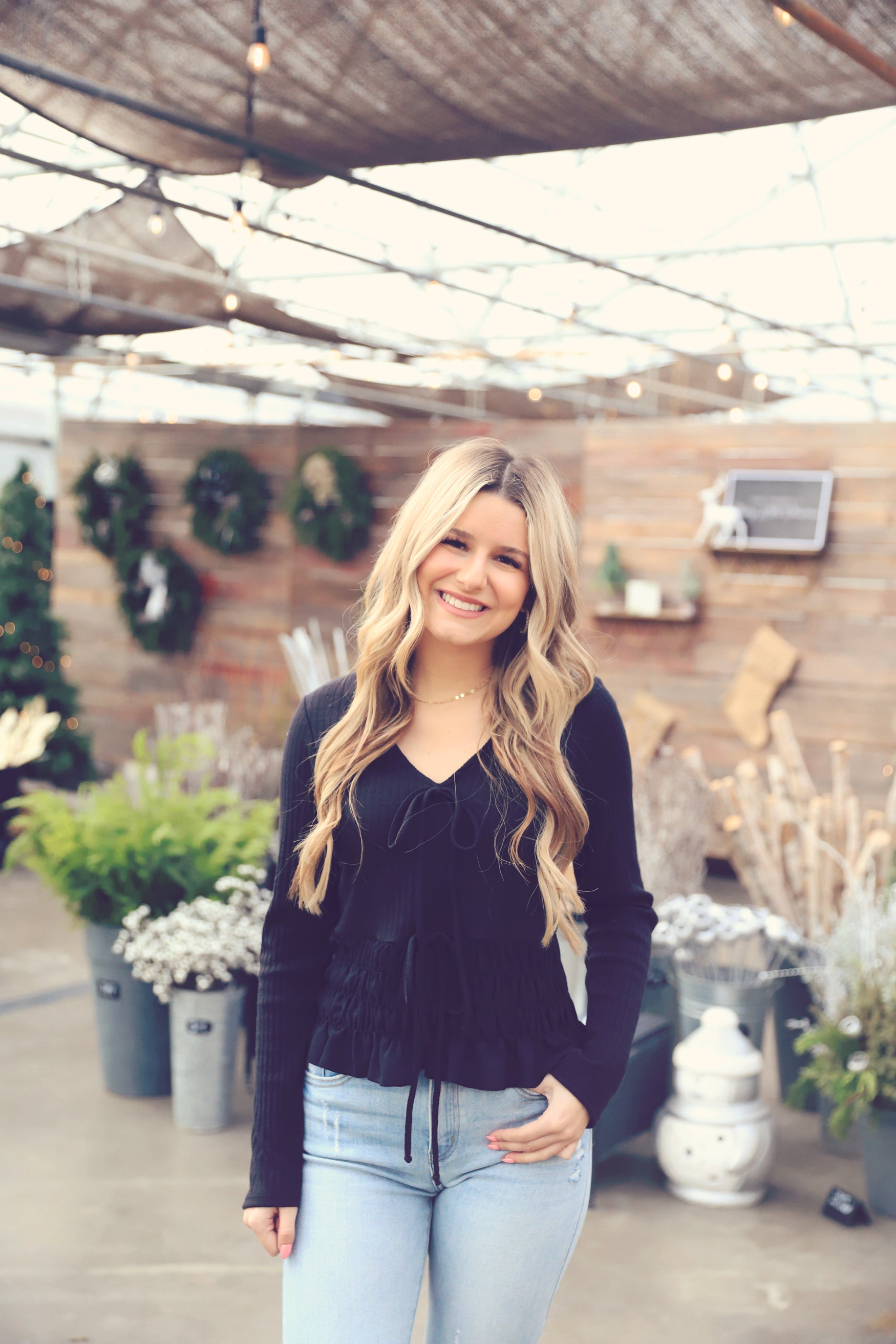The Black V-Neck Front Tie Ruffle Top is effortlessly flirty and feminine. Made from soft ribbed fabric, it features a flattering V-neckline, double front tie details, and a ruffled hem that adds just the right touch of charm. Pair it with high-rise jeans or a sleek skirt for a chic, easy look.