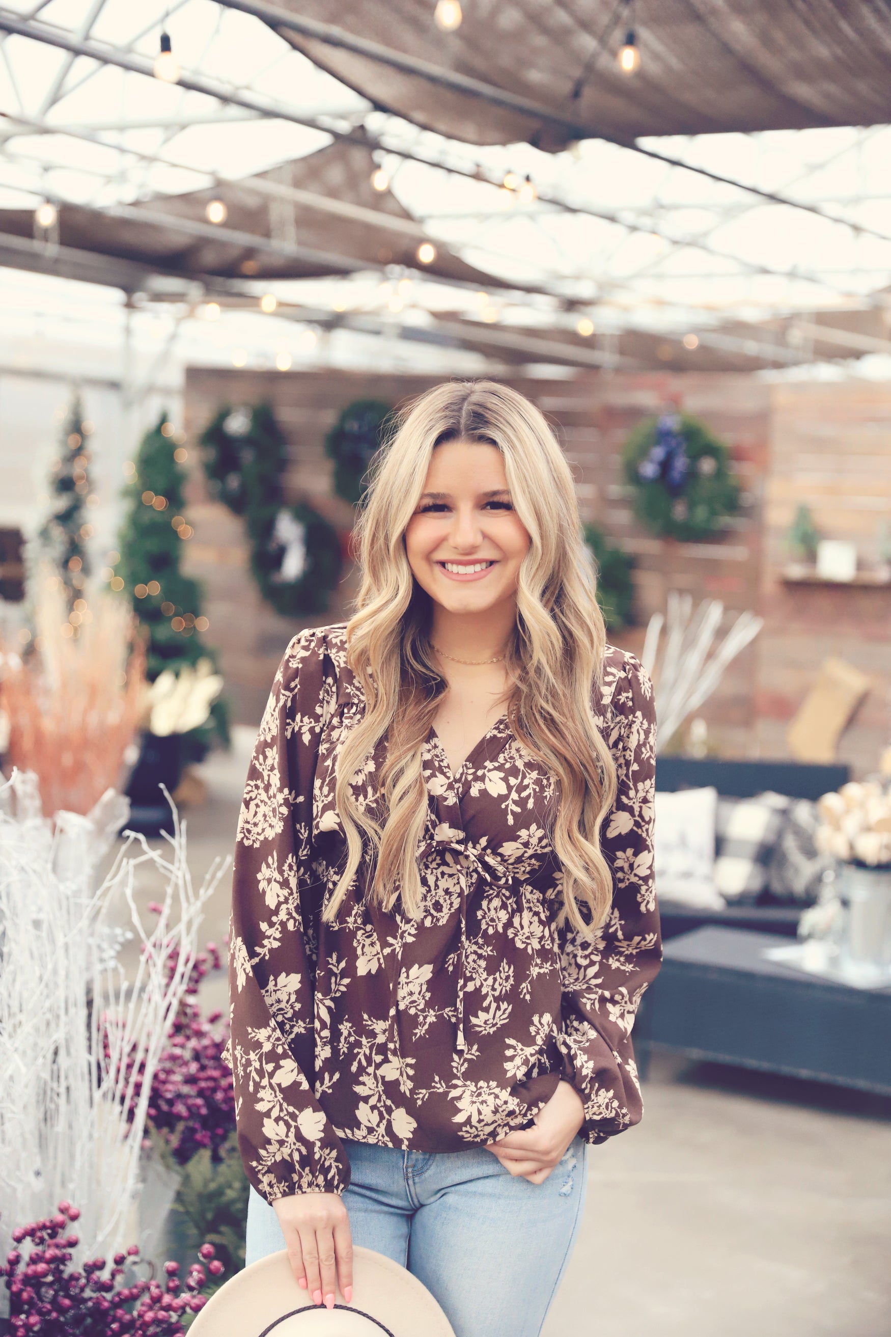 The Brown Floral Front Tie Flared Hem Top is a soft, feminine staple. Featuring a surplice neckline with a self-tie and airy bubble sleeves with elastic cuffs, it creates a flattering, effortless silhouette. Pair it with denim or a flowy skirt for a charming, everyday look.
